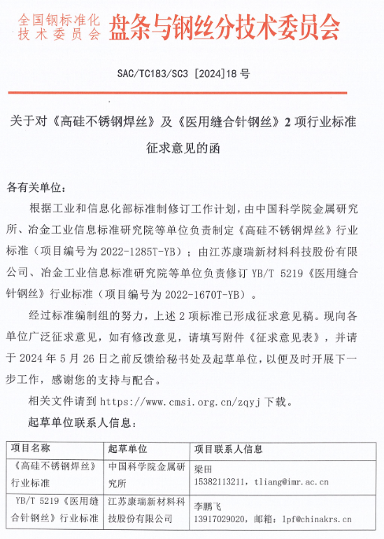 4月25日,由中國科學院金屬研究所、冶金工業信息標準研究院等單位負責制定《高硅不銹鋼焊絲》行業標準(項目編號為2022-1285T-YB)已形成征求意見稿。